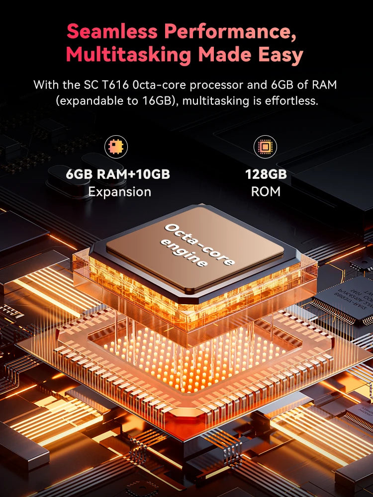 With the SC T616 Octa-core processor and 6GB of RAM (expandable to 16GB), multitasking is effortless. Manage apps, games, and tasks with ease. Plus, enjoy 128GB of internal storage, with the option to expand up to 1TB via TF card, giving you endless space for all your media, files, and apps.All-Day Power