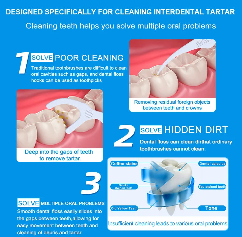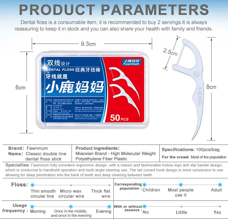 Packaging includes:1 box * 50 pcs * Dental Flosspicks/2 box * 50 pcs * Dental Flosspicks
