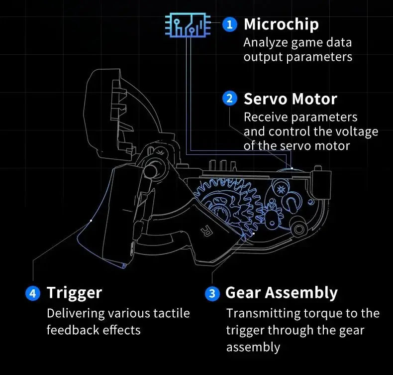 Force feedback trigger with ul-tra-precision force feedbackservos and a micrometer-levelgear structure,brings players amore immersive gaming experi-ence.
