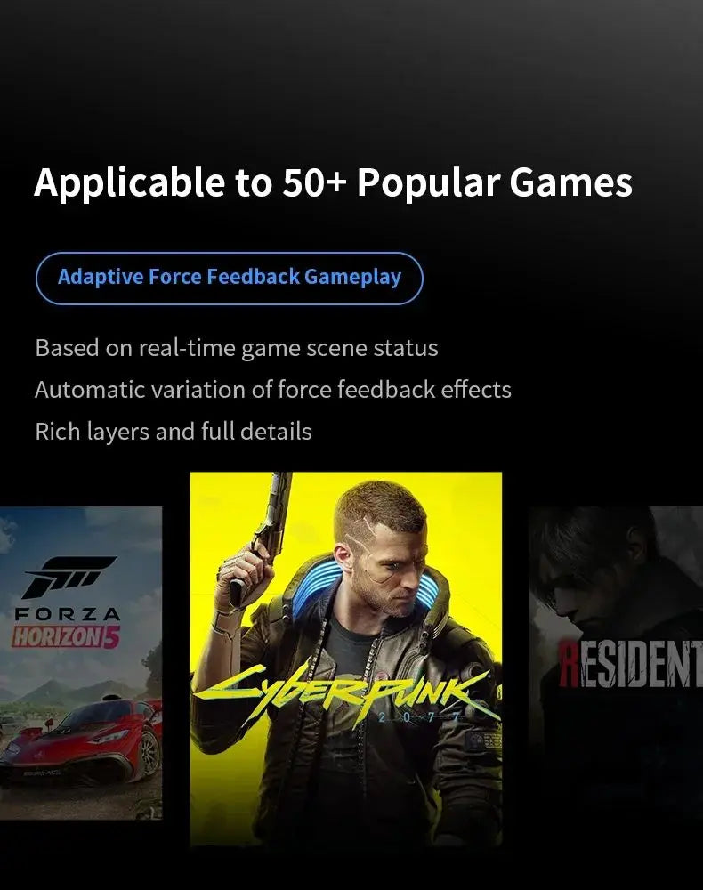Adaptive Force Feedback Gameplay, Based on real-time game scene status, Automatic variation of force feedback effectsRich layers and full details.