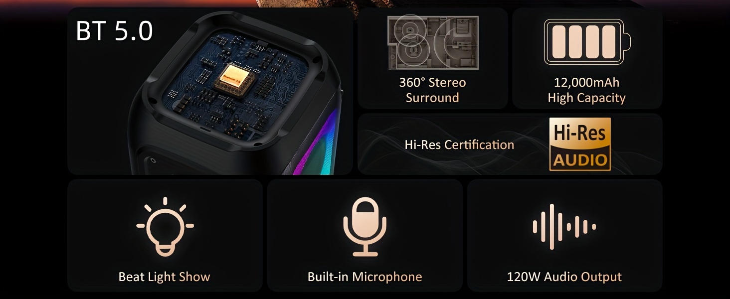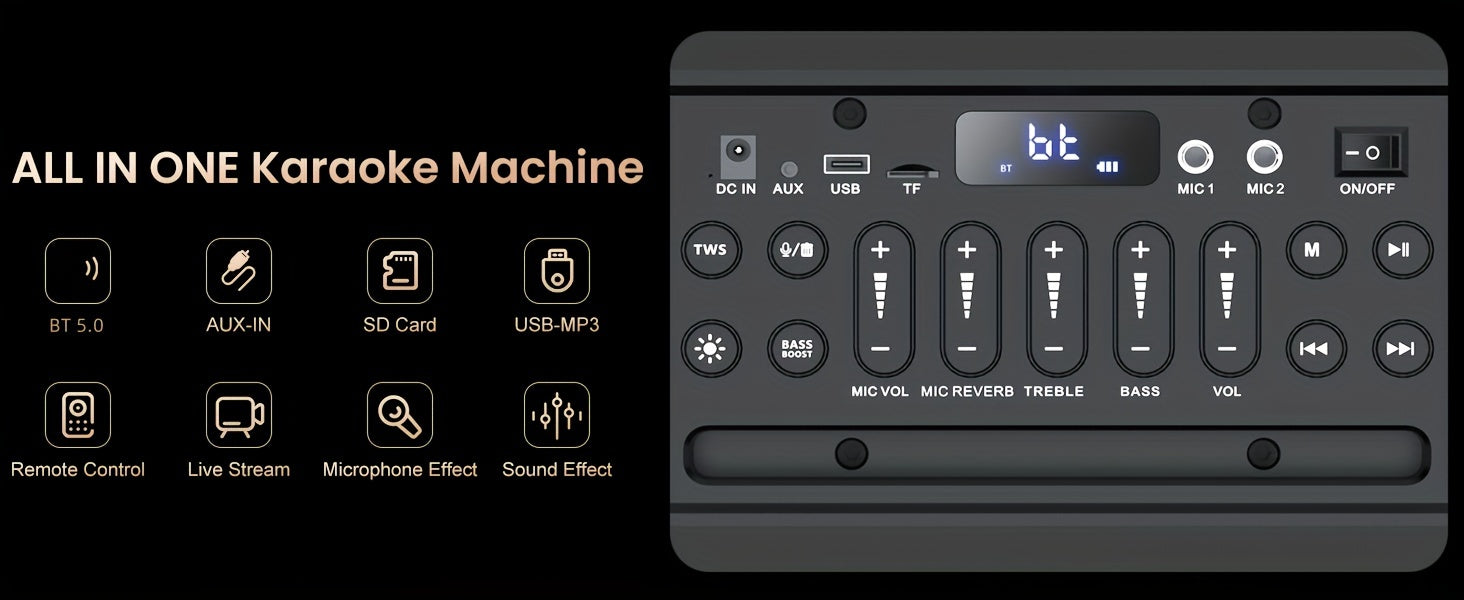 T11-T Bluetooth Karaoke Machine with 2 Wireless Microphones, Beat Light Show, and AUX Input for Home Parties