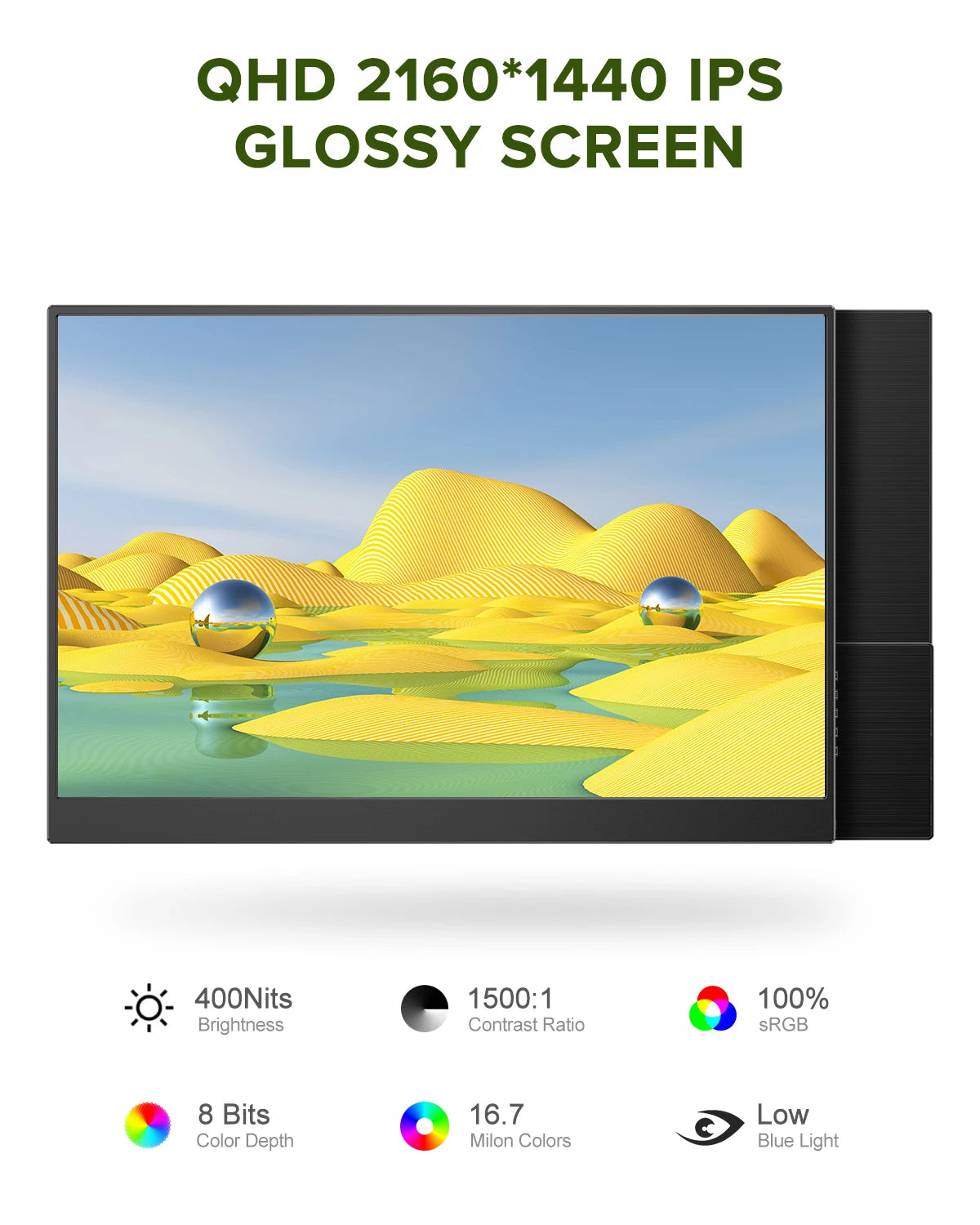 UPERFECT New 14inch portable monitor with 2K high resolution, FreeSync and HDR; QHD 2160*1440 resolution presenting rich and bright colors and delicate and realistic pictures; Enjoy seamless motion clarity with FreeSync and HDR. Suitable for photo workers, game and movie lovers; Clear and accurate color rendering improves your work efficiency and accuracy